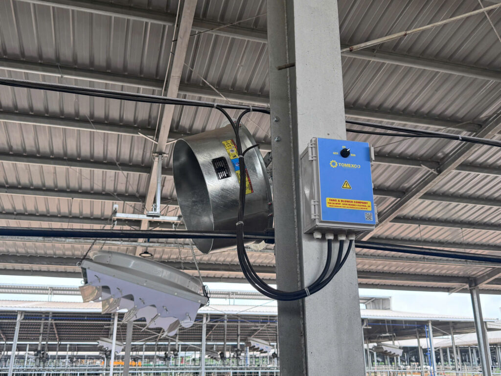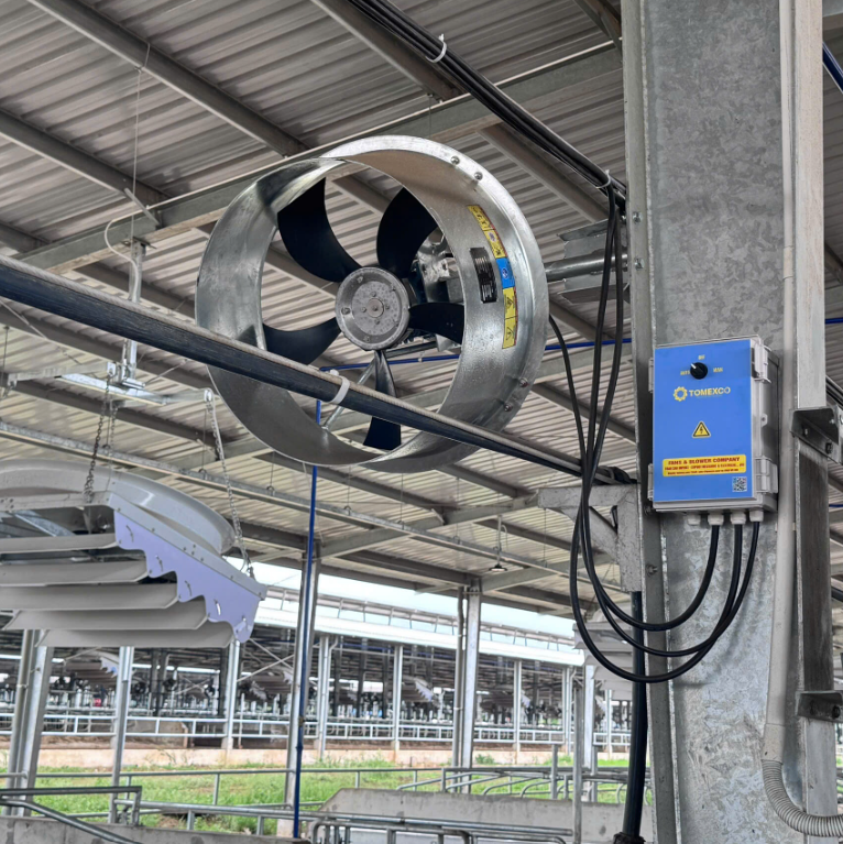 Hệ thống quạt thông gió được điều khiển thông qua biến tần (VFD), cho phép điều chỉnh tốc độ quạt linh hoạt theo điều kiện môi trường thực tế. Việc điều khiển được dựa trên chỉ số THI (Temperature – Humidity Index), là chỉ số tổng hợp đánh giá mức độ stress nhiệt của bò sữa dựa trên nhiệt độ và độ ẩm môi trường.