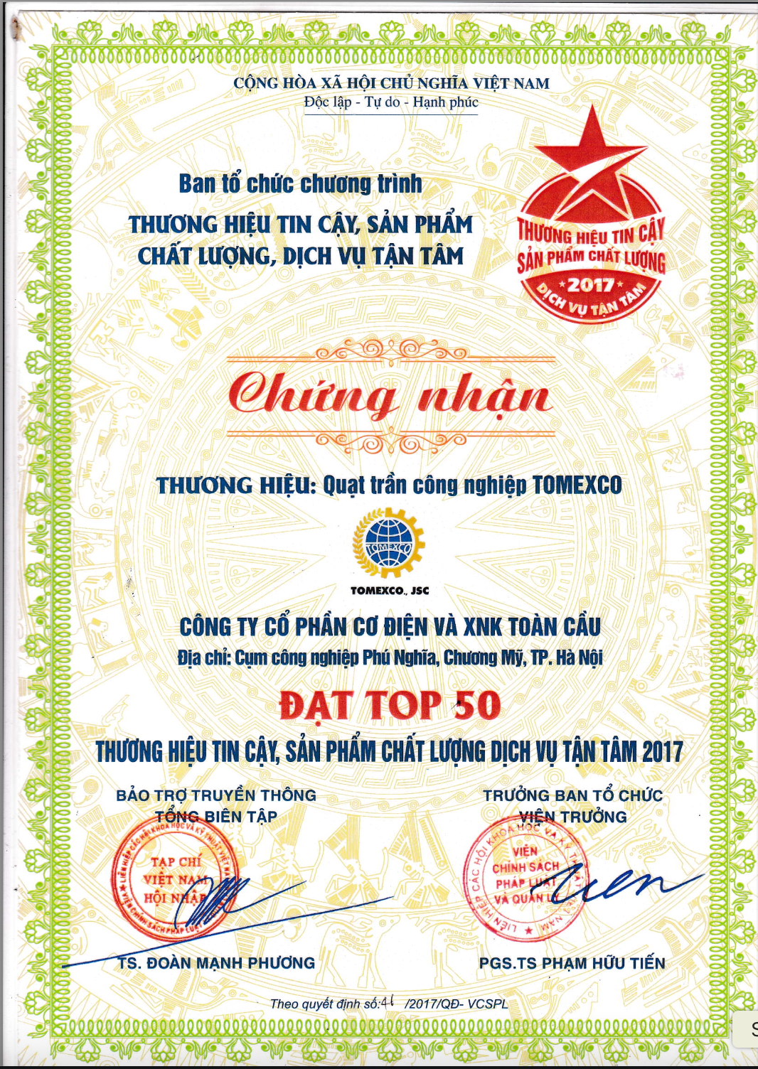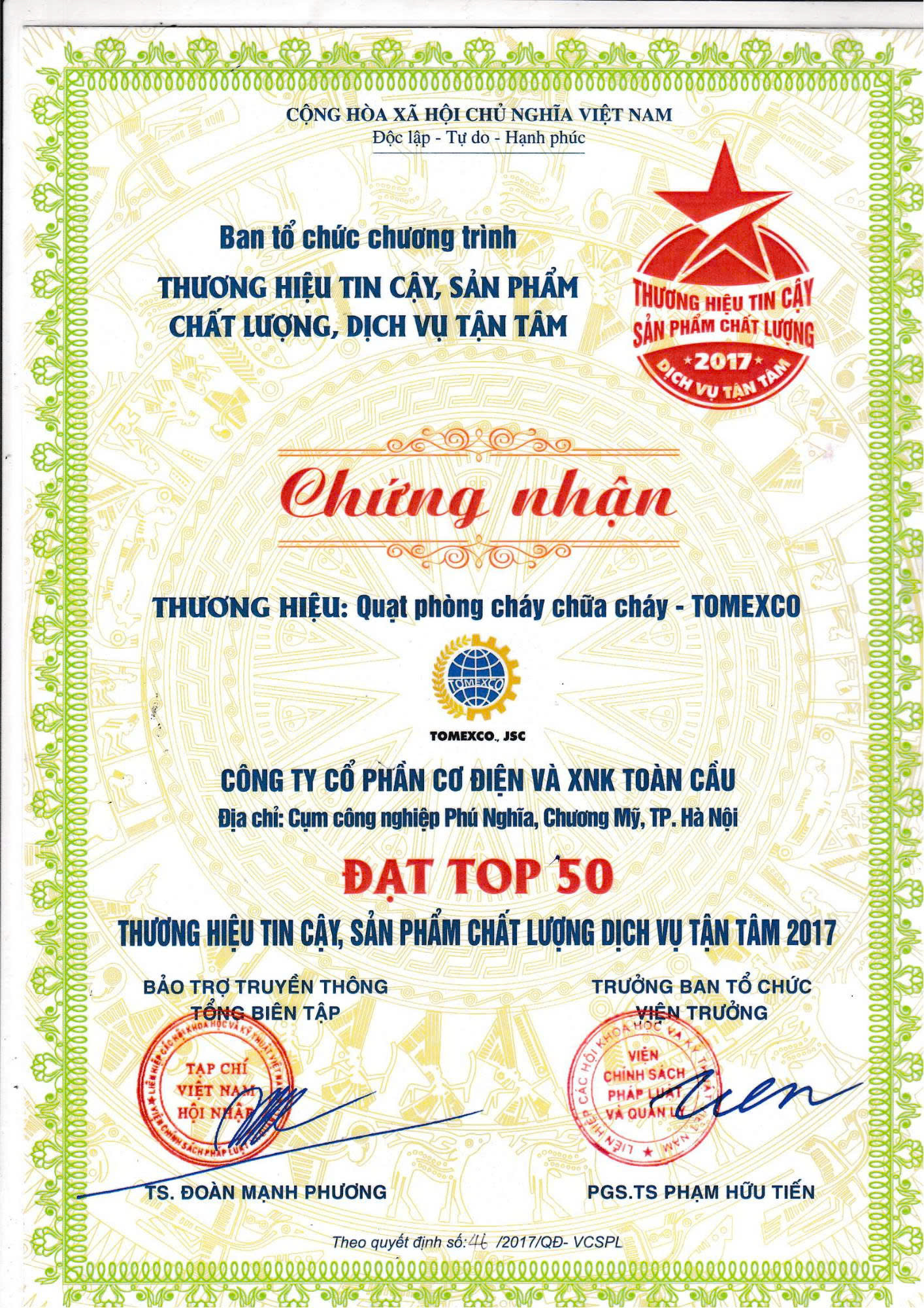 - Top 50 thương hiệu tin cậy, sản phẩm chất lượng, dịch vụ tận tâm năm 2017