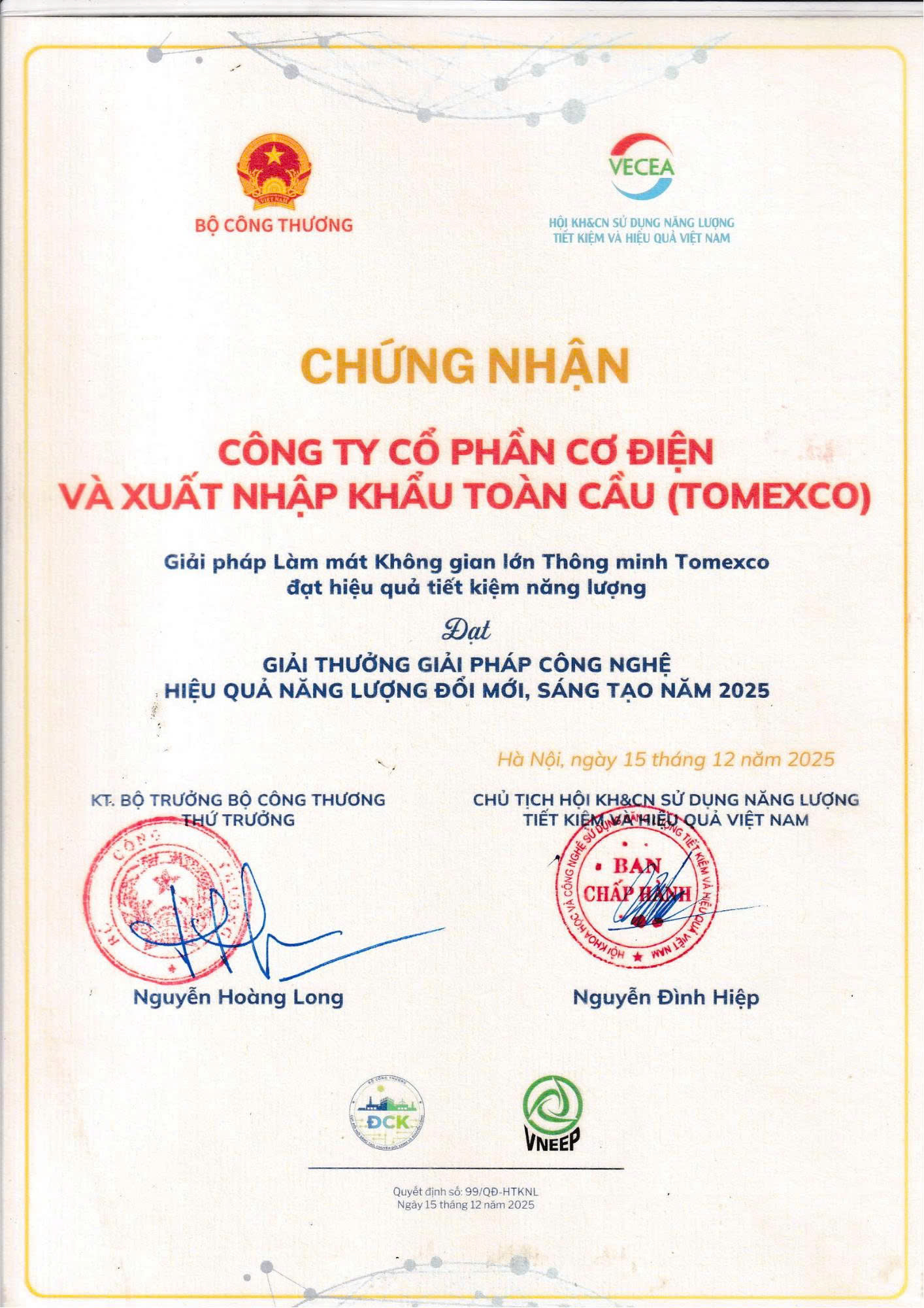 - Giải thưởng Giải pháp công nghệ hiệu quả năng lượng đổi mới, sáng tạo năm 2025 của Bộ Công thương